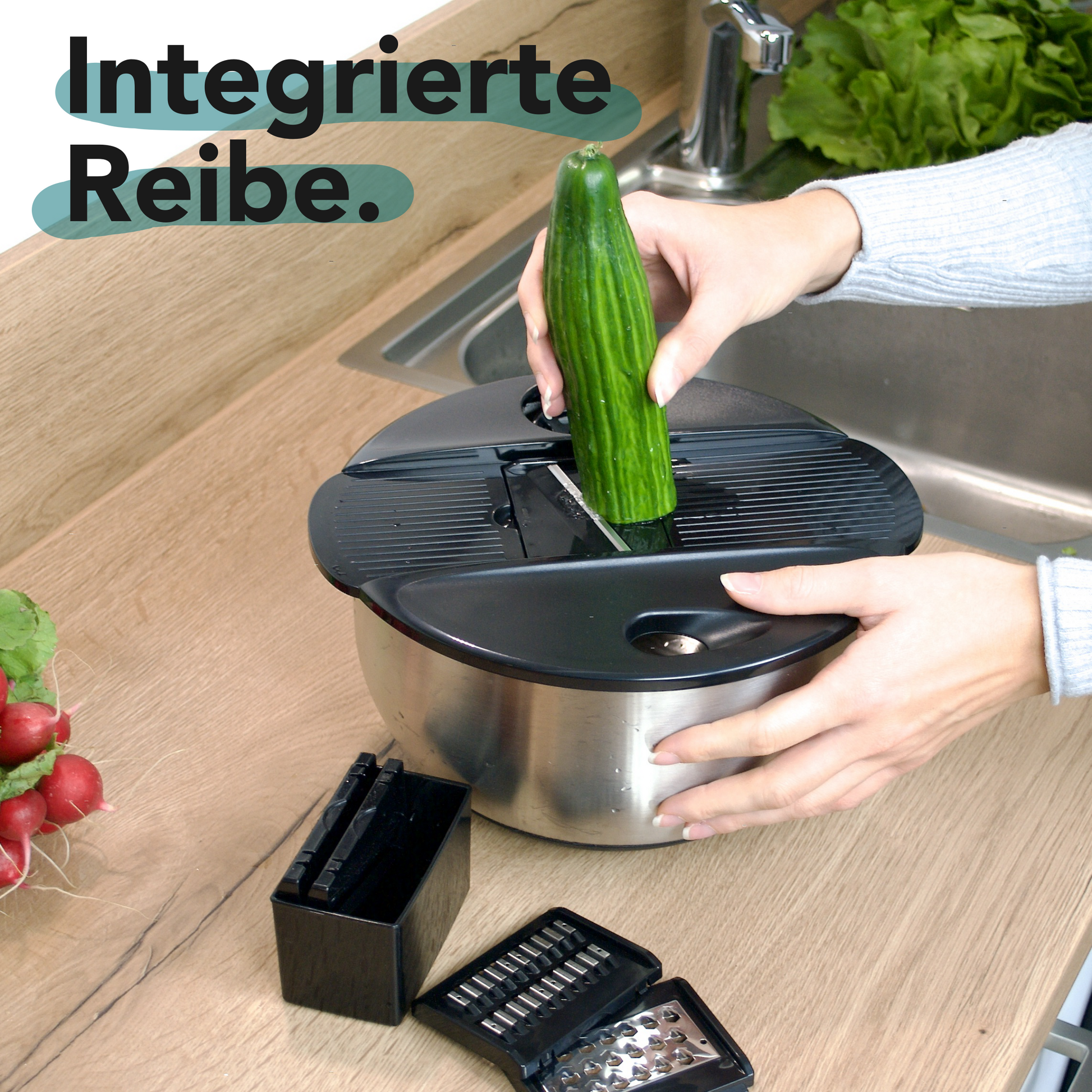 🧀 Vielseitige Reiben: Mit wechselbaren Edelstahl-Reiben für Käse, Gemüse und vieles mehr.